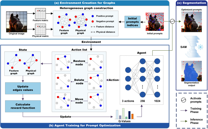 该研究创新性地提出即插即用双空间点提示优化器(Plug-and-Play PPO),通过深度强化学习技术突破传统视觉分割模型的性能瓶颈。研究团队构建双空间异构图架构,巧妙融合预训练模型的特征匹配能力与物理空间距离信息,利用动态策略网络实现提示点的智能优化。该方法的革命性在于无需额外训练即可适配各类分割任务,显著提升了基础模型SAM在复杂场景下的分割精度。吴永飞副教授作为通讯作者表示:“PPO技术为视觉基础模型的优化提供了新范式,下一步我们将推动该技术在医疗影像分析、自动驾驶等领域的应用转化”。